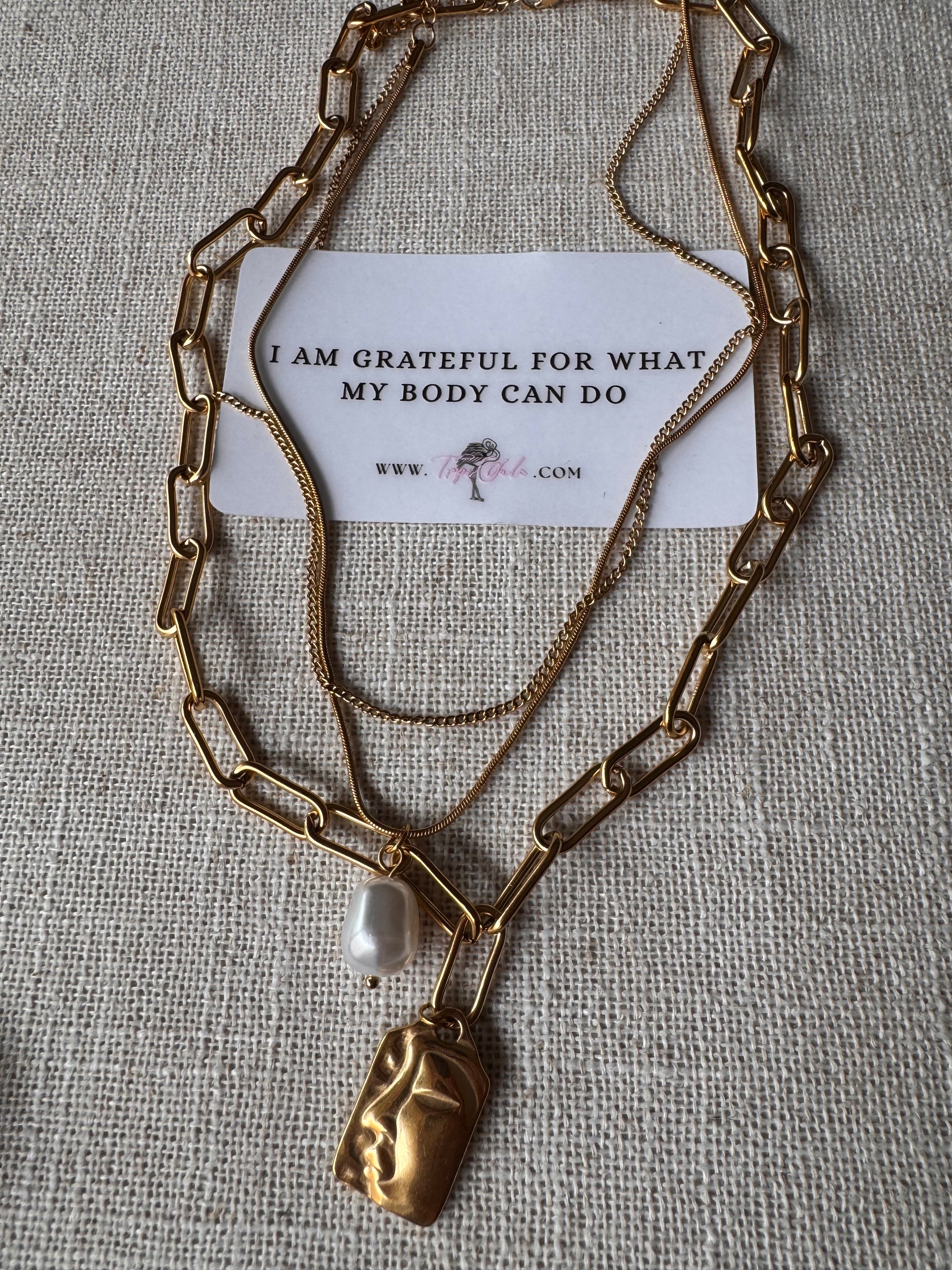 3 piece layered piece. gold large link chain, mini link chain, and solid chain. artistic feminine side profile pendant and pearl pendant